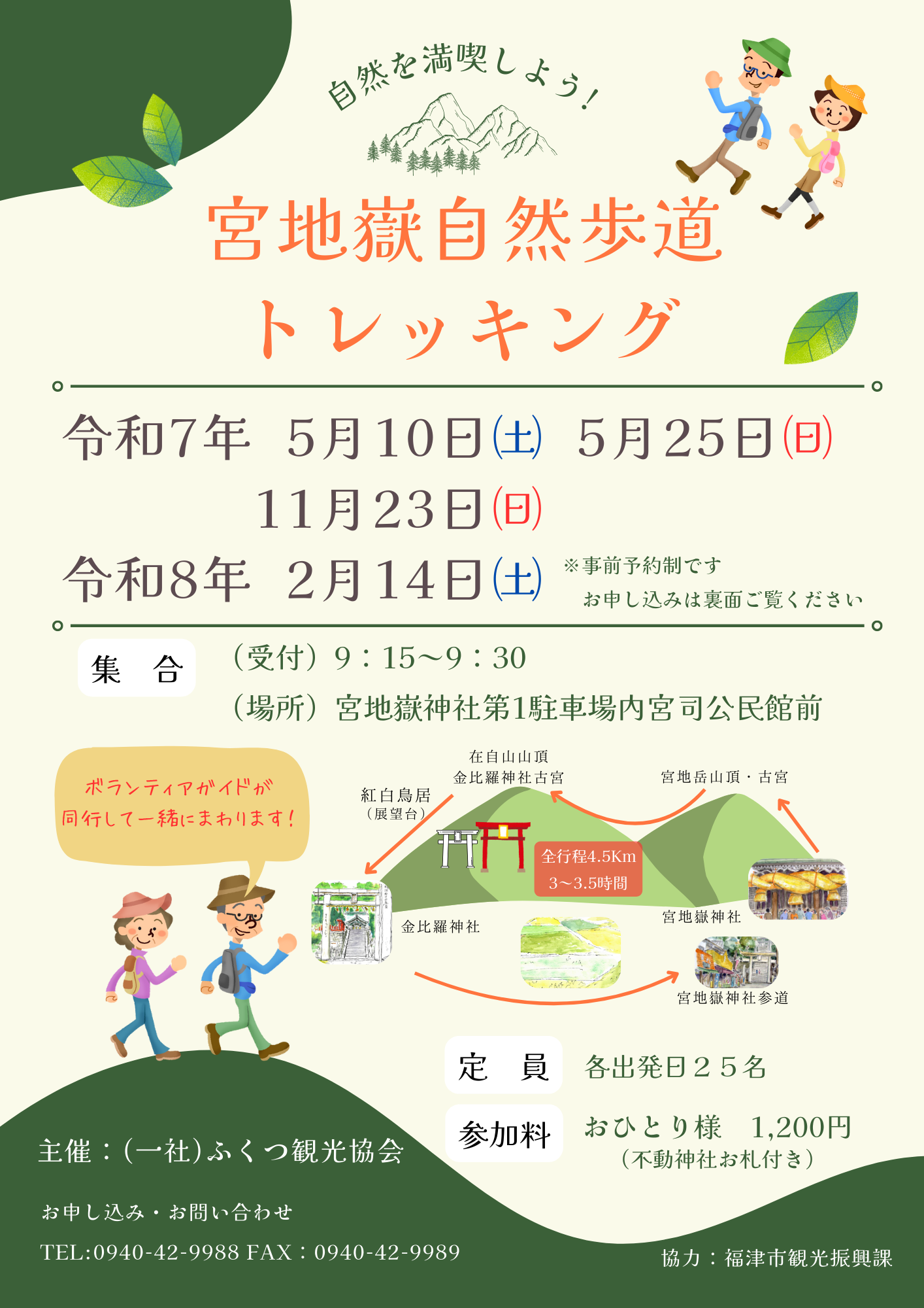 | 備考 | ※山歩きをしますので、動きやすい服装でお願いします。昼食は各自持参でお願いします。 ※イベント3日前までに、窓口又はFAX・メールにて事前予約をお願いします。 【申込方法】 ・窓口:福間駅2階「ふっくる」窓口にて直接申し込み ・FAX:チラシの裏面を記入の上、FAX(0940-42-9998)へ ・メール:必要事項を記入の上、info@fukutsukankou.comへ申し込み |