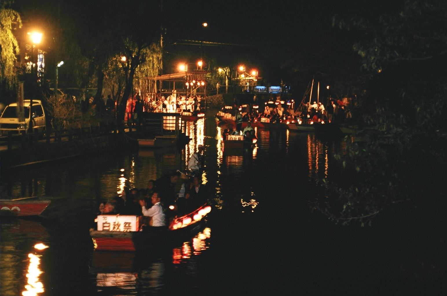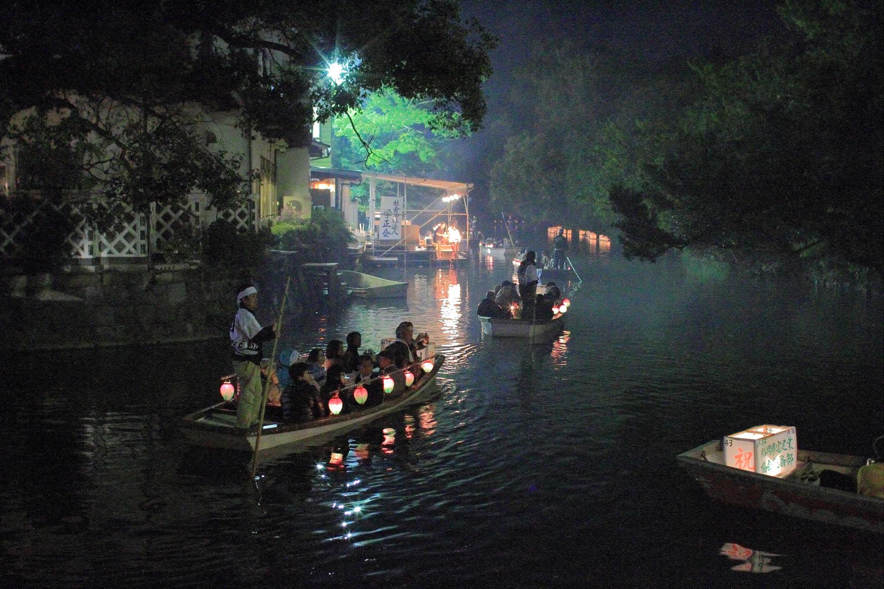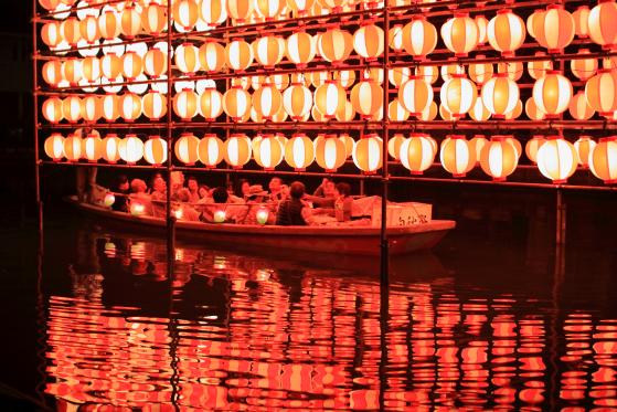 水面には行灯が浮かび、また、市民の皆さんの心のこもった歓迎・おもてなしを感じながら最終地点では打ち上げ花火でフィナーレを迎えます。