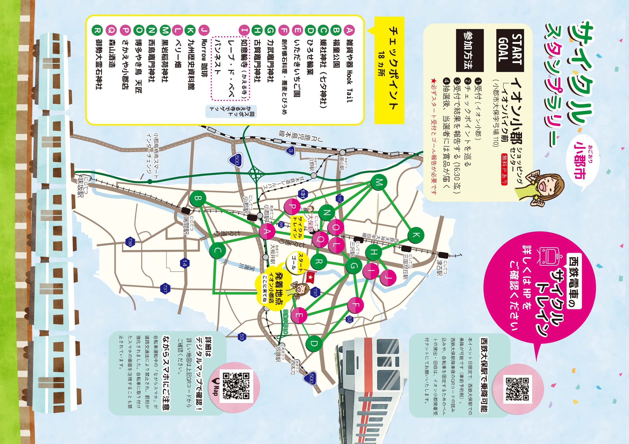 自転車利用者が気軽に立ち寄れるスポット「福岡サイクルステーション」(小郡市内21ヵ所)のうち、18ヵ所をチェックポイントとした、デジタルサイクルスタンプラリーを開催します。今回で5回目となる本イベントは、アップダウンの少ない小郡市の地形を活かし、初心者やファミリー層でも無理なく楽しめる内容です。期間中は、チェックポイントで使えるクーポンの配布や、集めたスタンプ数に応じた抽選賞品があります。さらにイベント日限定で、西鉄大保駅発着のサイクルトレインの運行や、イオン小郡店とのコラボ企画も実施します。その他、さくら祭りや新酒まつりなど地域イベントも開催されており、市内の魅力を自転車で巡りながら、買い物やグルメ、立ち寄りスポットとの出会いも楽しめる、小郡ならではのサイクルイベントです。