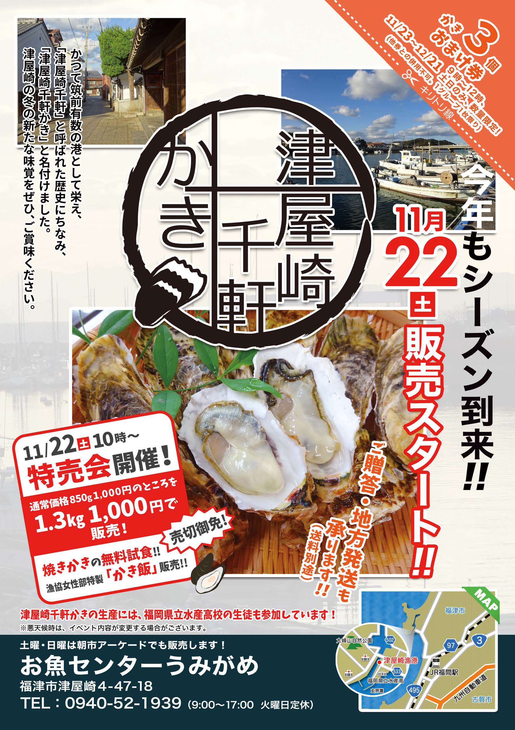福津のブランド牡蠣「津屋崎千軒かき」のシーズンが今年も到来します。2025年11月22日(土)からの販売スタートに伴い、津屋崎漁港にある「おさかなセンターうみがめ」で特売会が開催されます!通常850g 1,000円のところ、なんと1.3kg 1,000円で販売されます!(売り切れ御免)