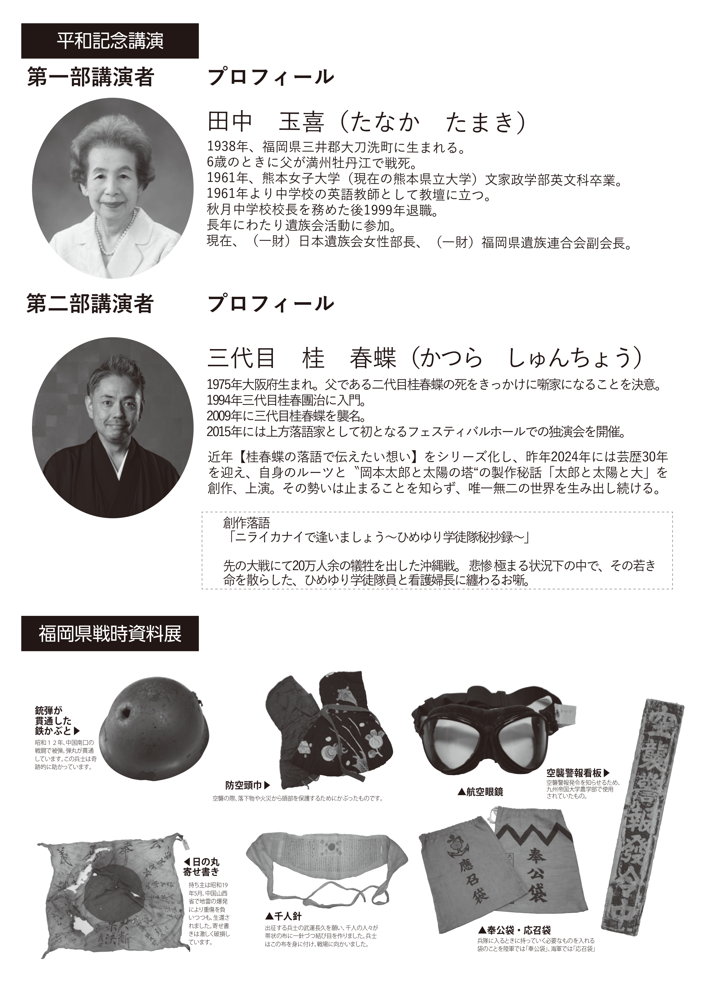 平和記念講演では、(一財)福岡県遺族連合会副会長の田中玉喜氏が「戦時下を生きた戦争体験者が語る平和への想い」を、三代目桂春蝶氏が落語で伝えたい想いシリーズ四作目「ニライカナイで逢いましょう〜ひめゆり学徒隊秘抄録〜」を披露します。