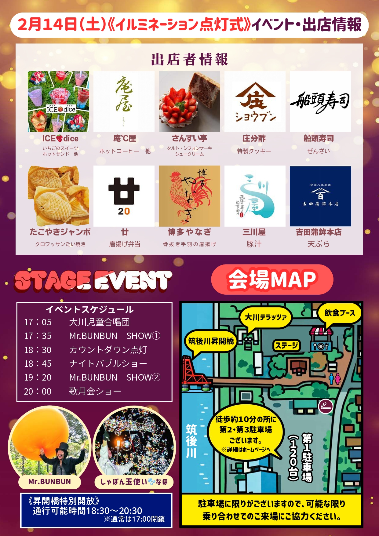 初日の17:00からは点灯式を実施。人気グルメ店の出店ステージイベントのほか、通常は17:00に閉鎖される昇開橋が18:30から2時間、特別に開放され、通行できます。スイーツや温かい食べ物を楽しみながら、イルミネーションをお楽しみください。