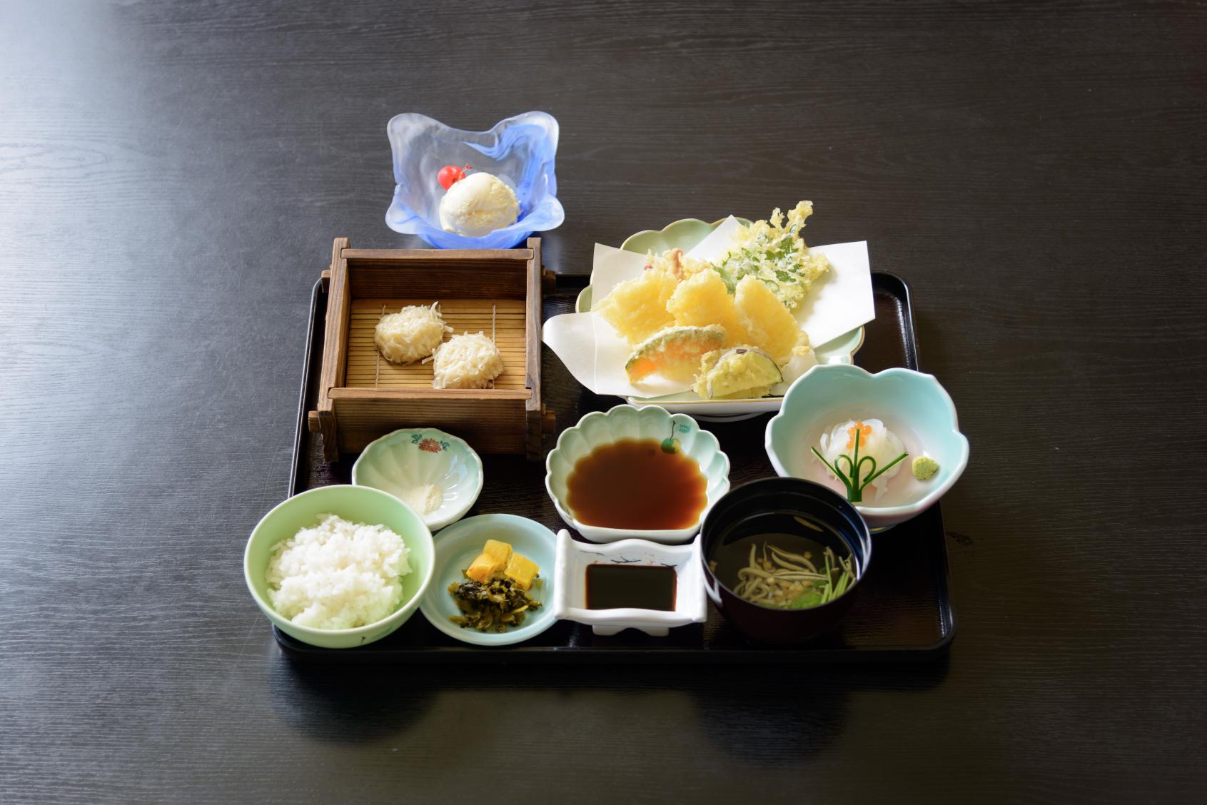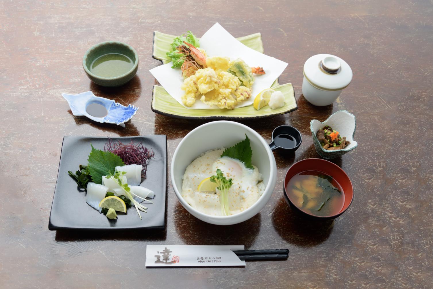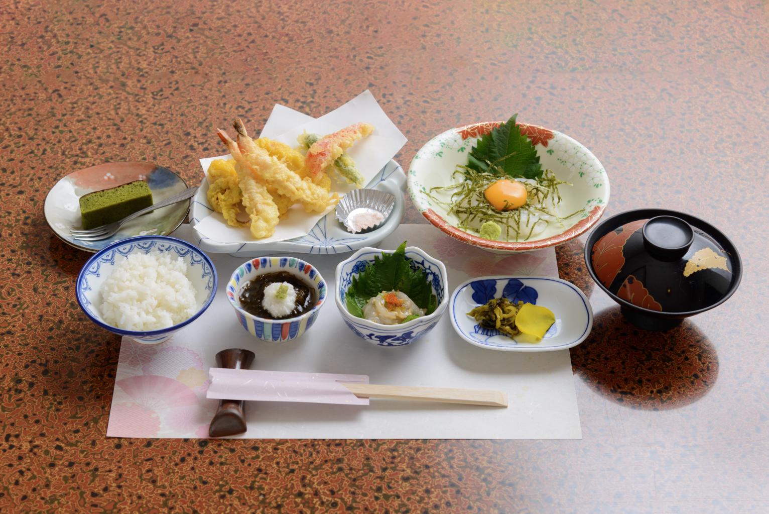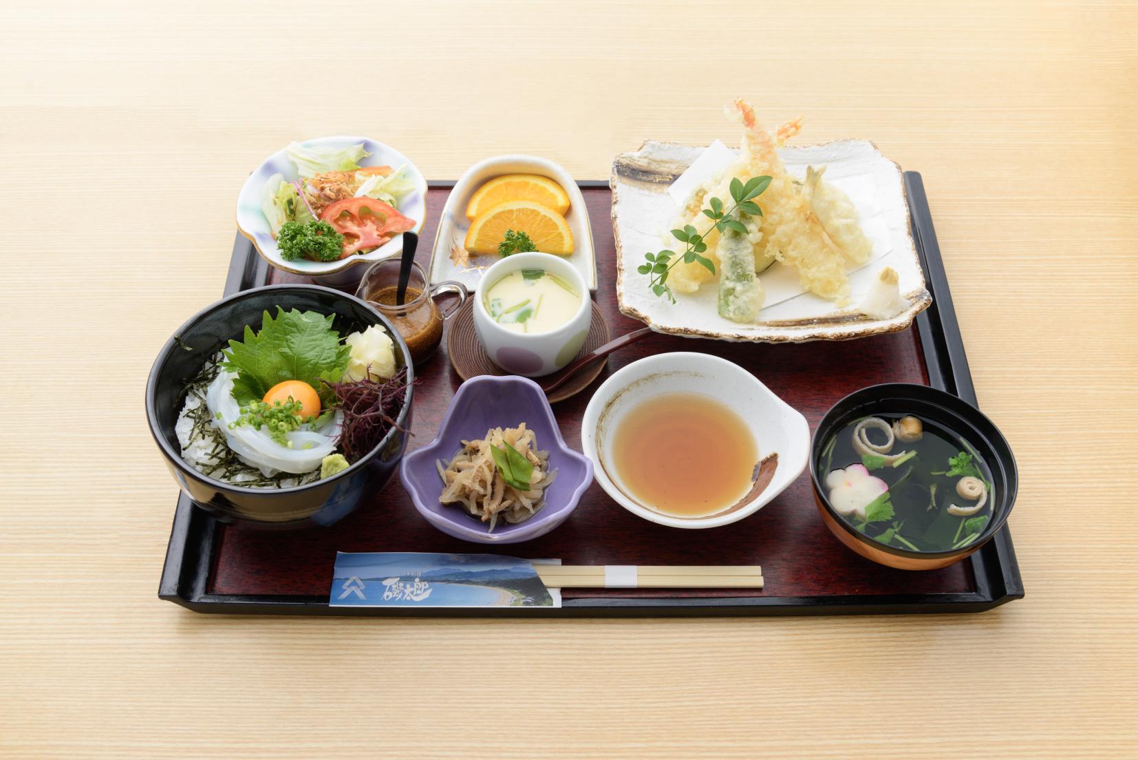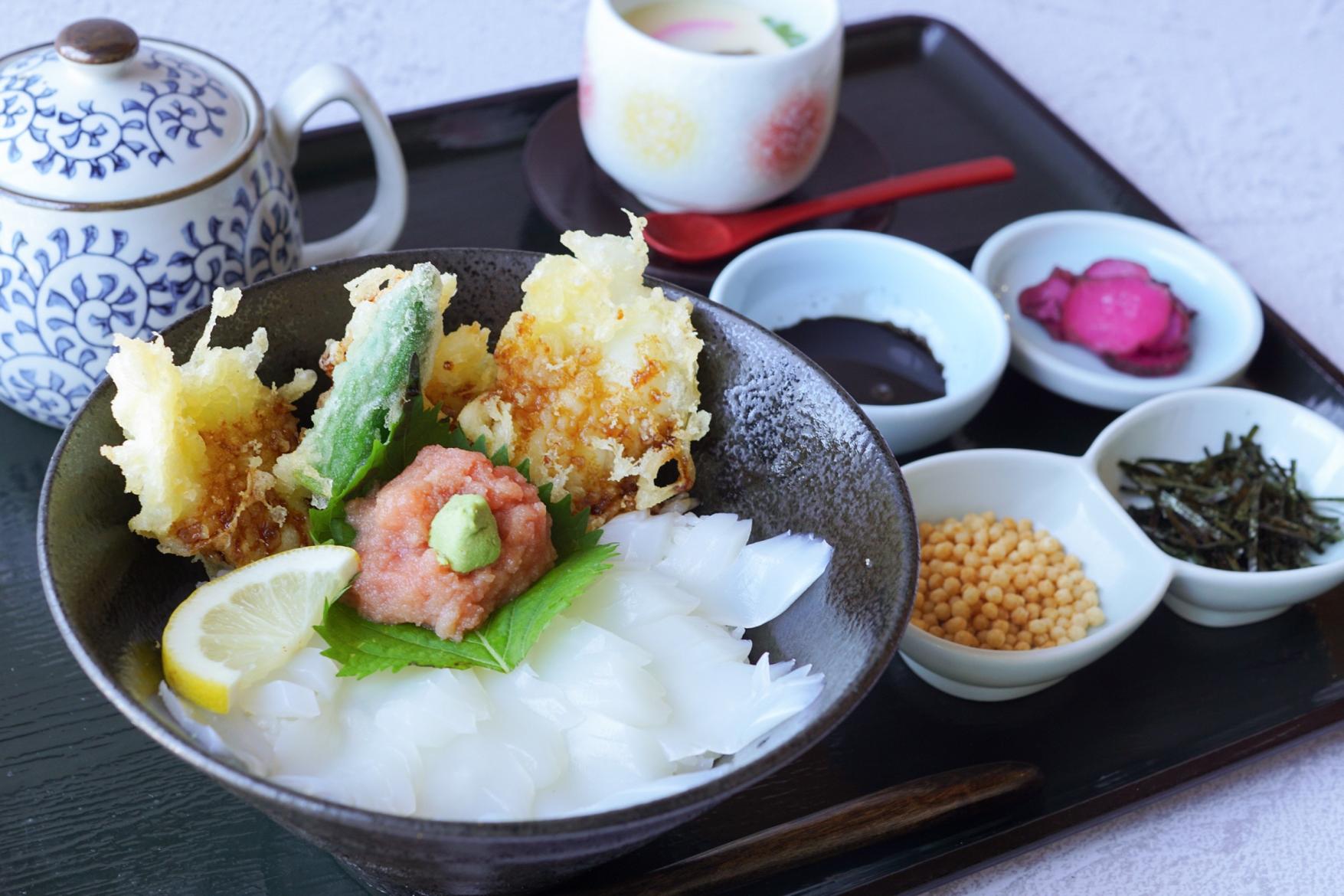 ヤリイカの刺身と天ぷらを主菜に、小鉢2品、茶碗蒸し付きの贅沢御膳。