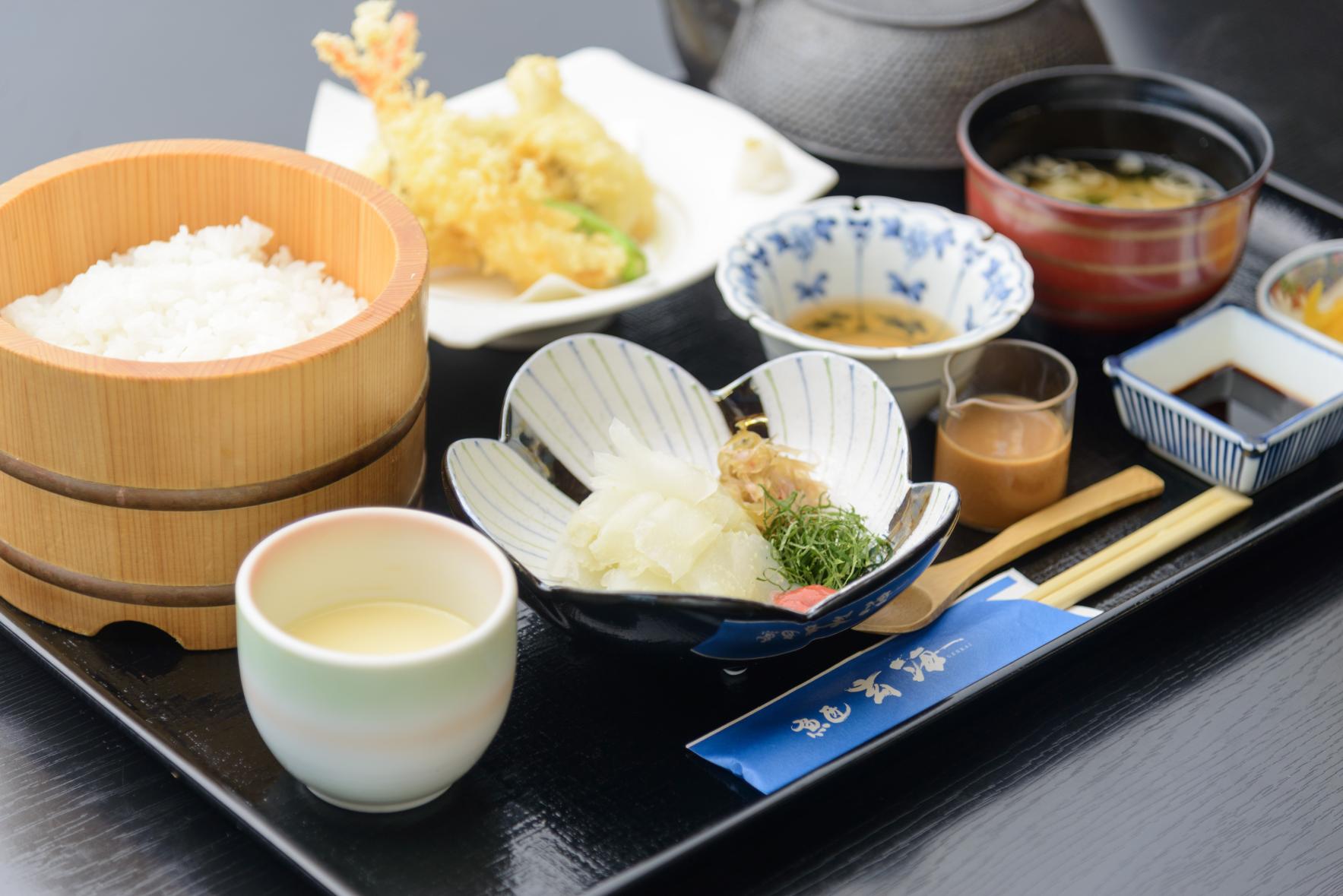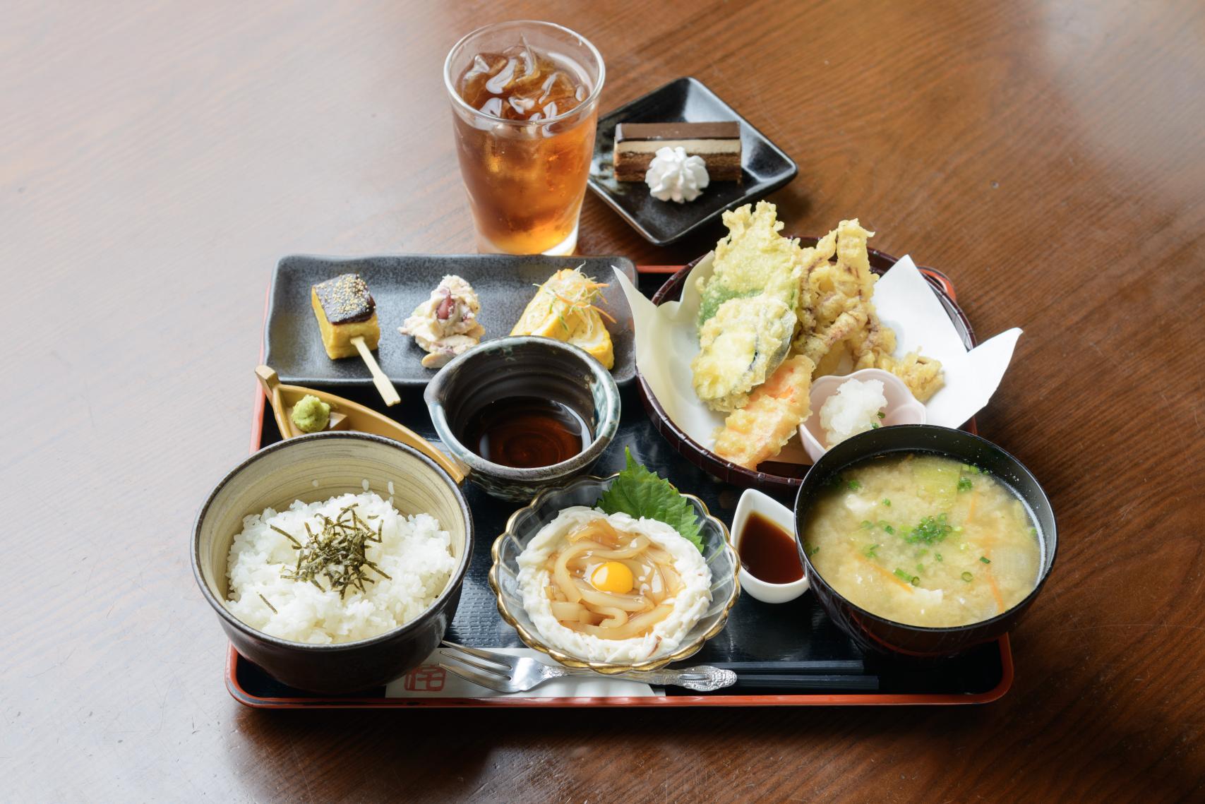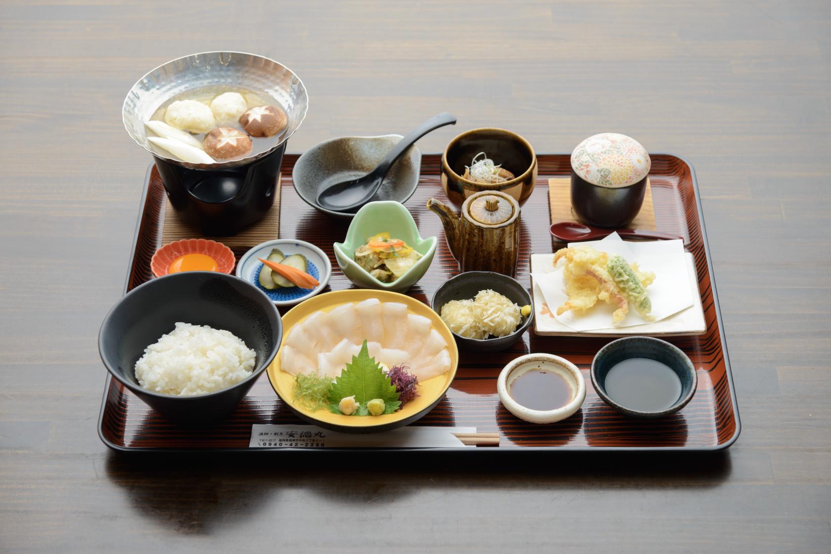 名物とん汁、天ぷら、惣菜3点盛付きの豪華定食。イカ刺×細切り山芋の食感が絶妙。