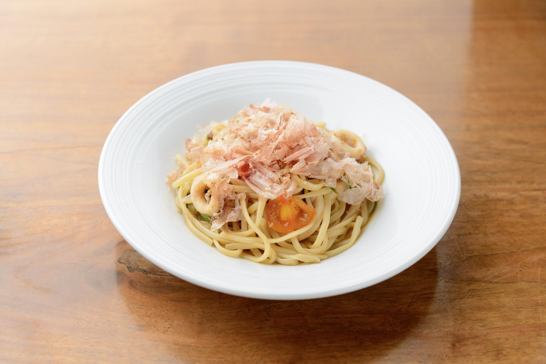 イカの甘味、トマトの酸味、鰹節の香りが調和する、創意溢れるパスタ。