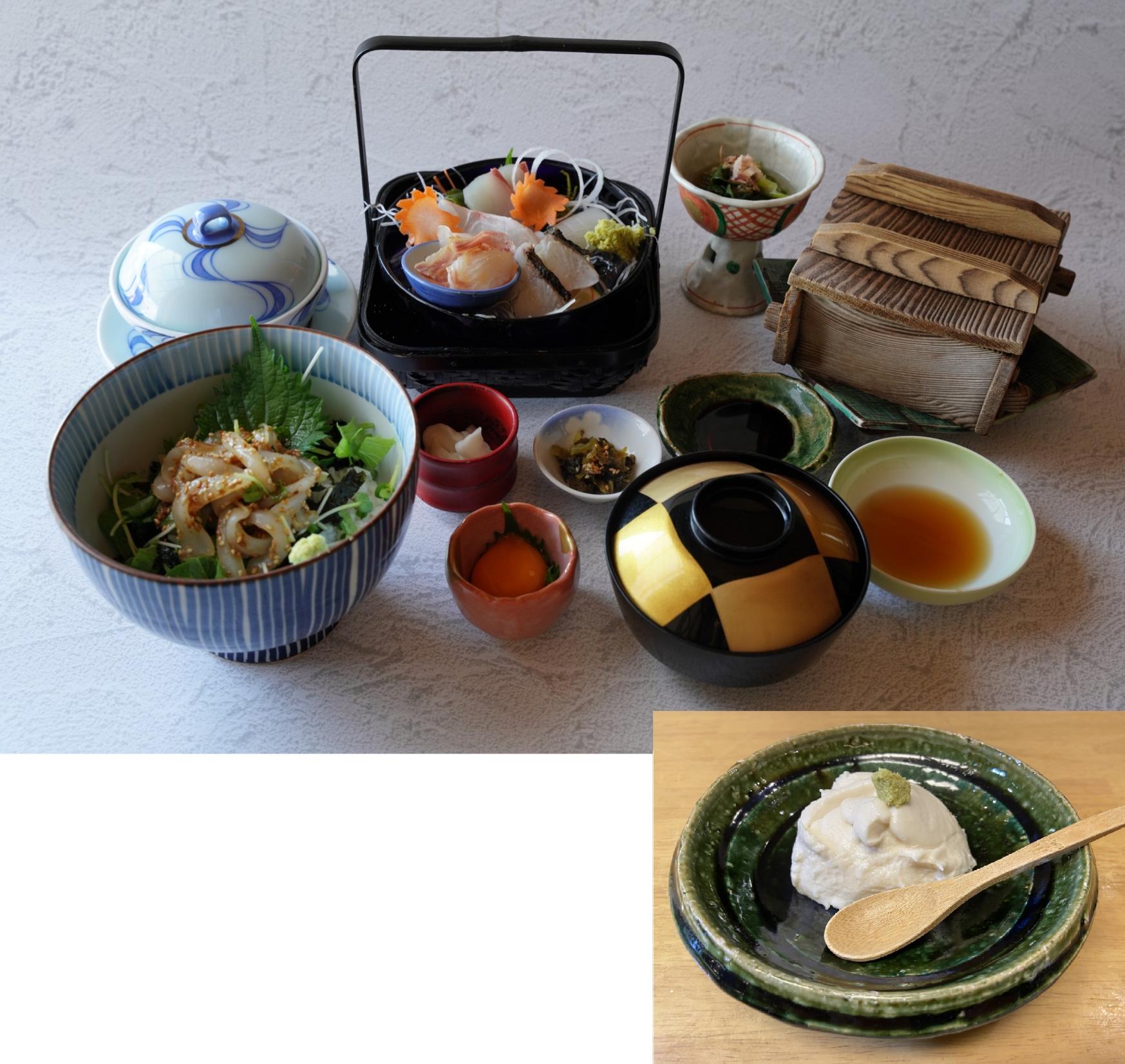 特製ダレでいただくイカ、天然魚の刺身の盛り合わせのほか、人気の白子葛豆腐も付く。