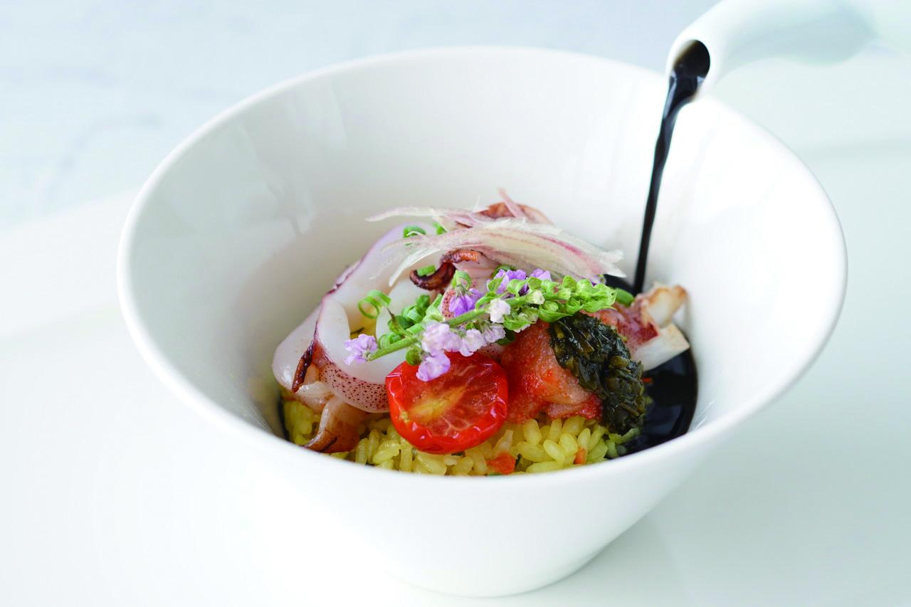 ソテーしたヤリイカとサフランライス、イカ墨ブイヤベースで魚介の旨味を満喫!