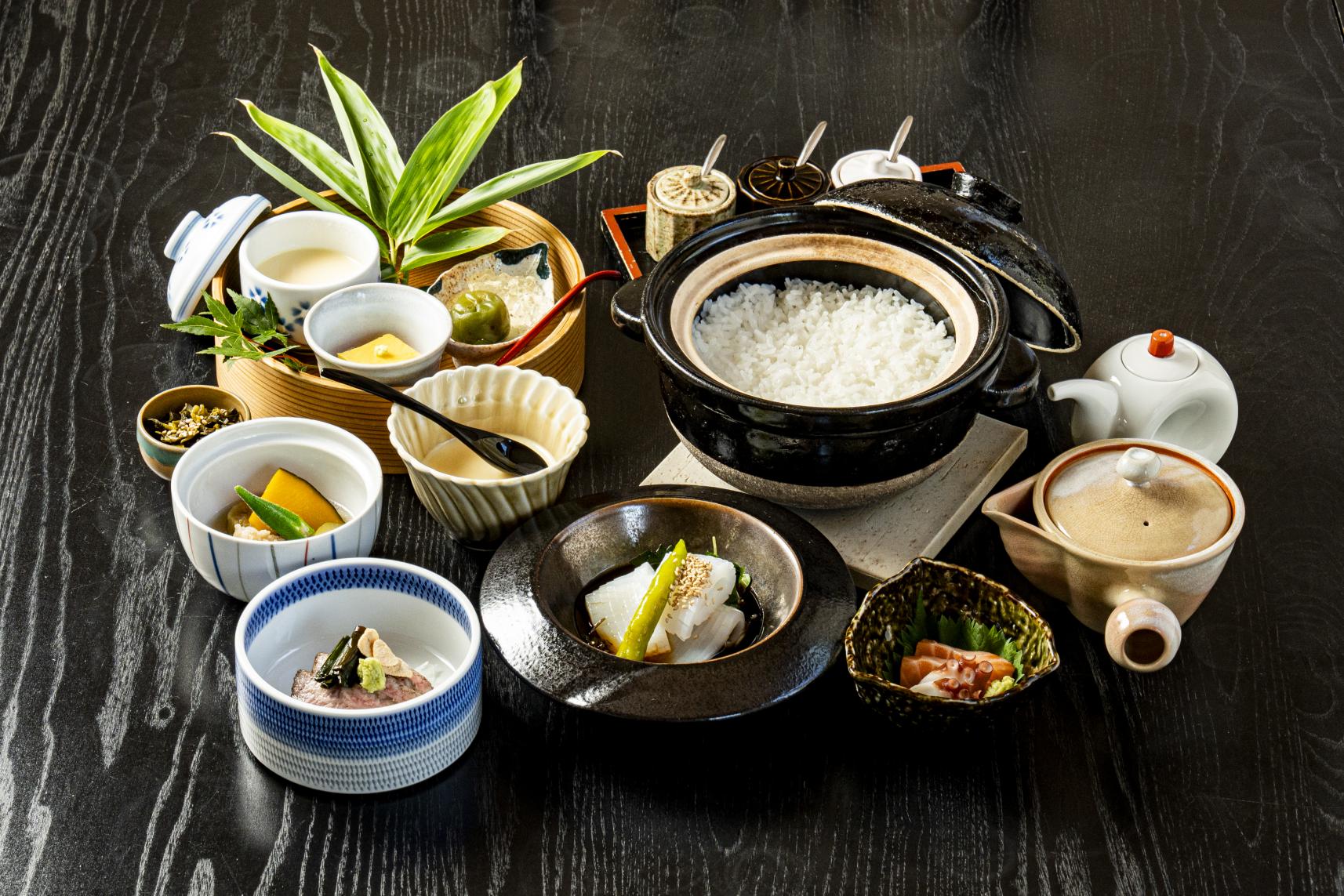 炊き立ての土鍋ご飯の上にイカを乗せてお茶漬けに。手の込んだ小鉢も堪能して。