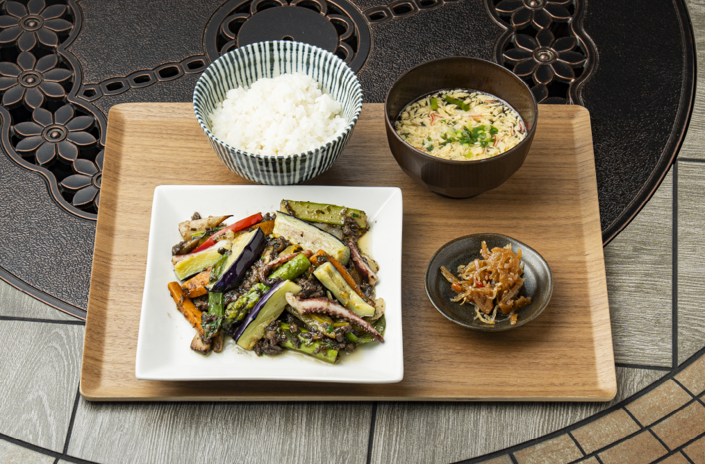 イカスミの旨味を効かせた“変化球麻婆”。夏野菜と和牛ミンチ、イカゲソと具材たっぷり!