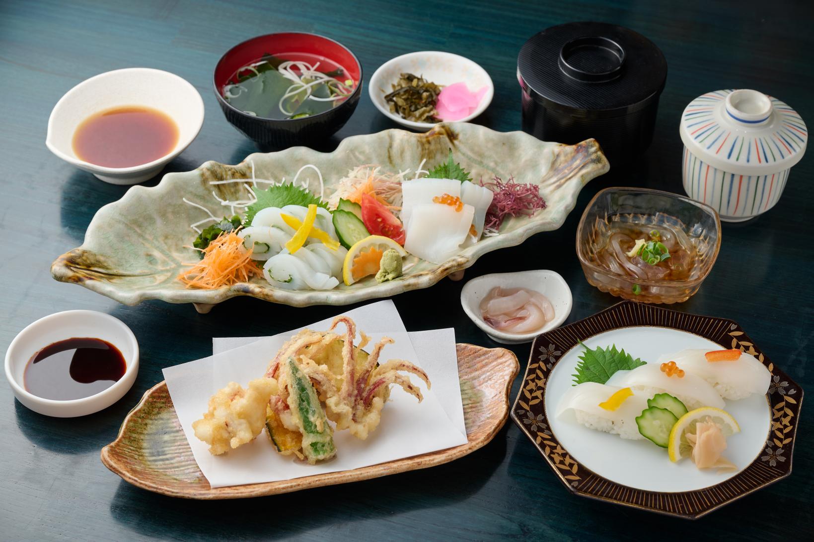 イカの刺身・寿司・天ぷらなどが付く、コスパ抜群のセットメニュー。