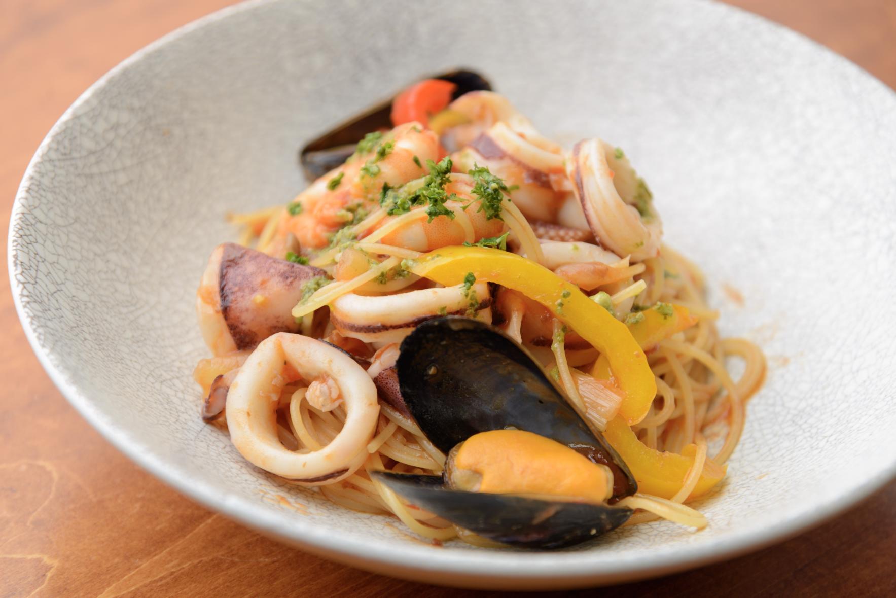 イカ、魚介、トマトの旨味が重なり、満足感は十分。細麺が舌に心地よい。