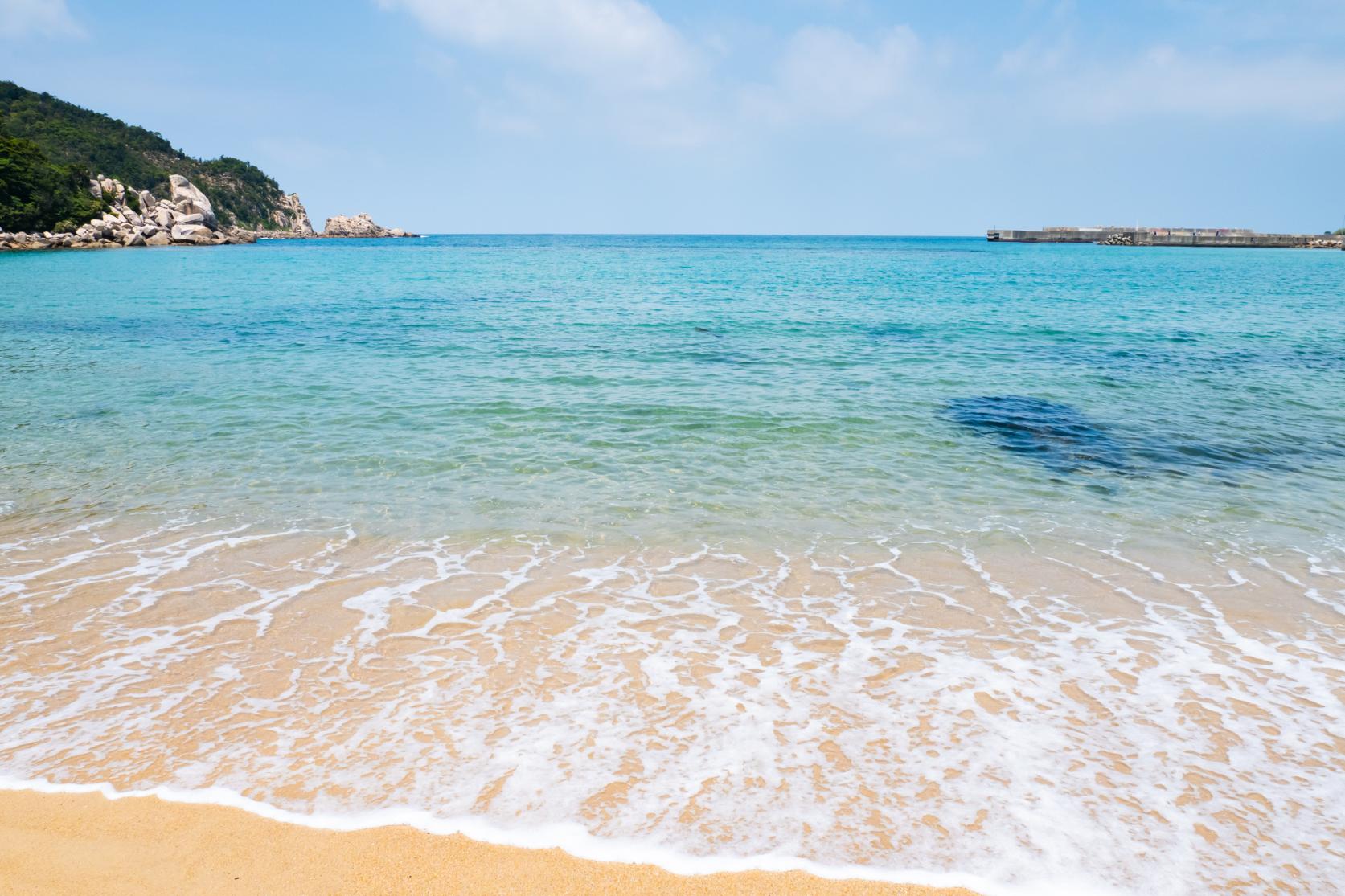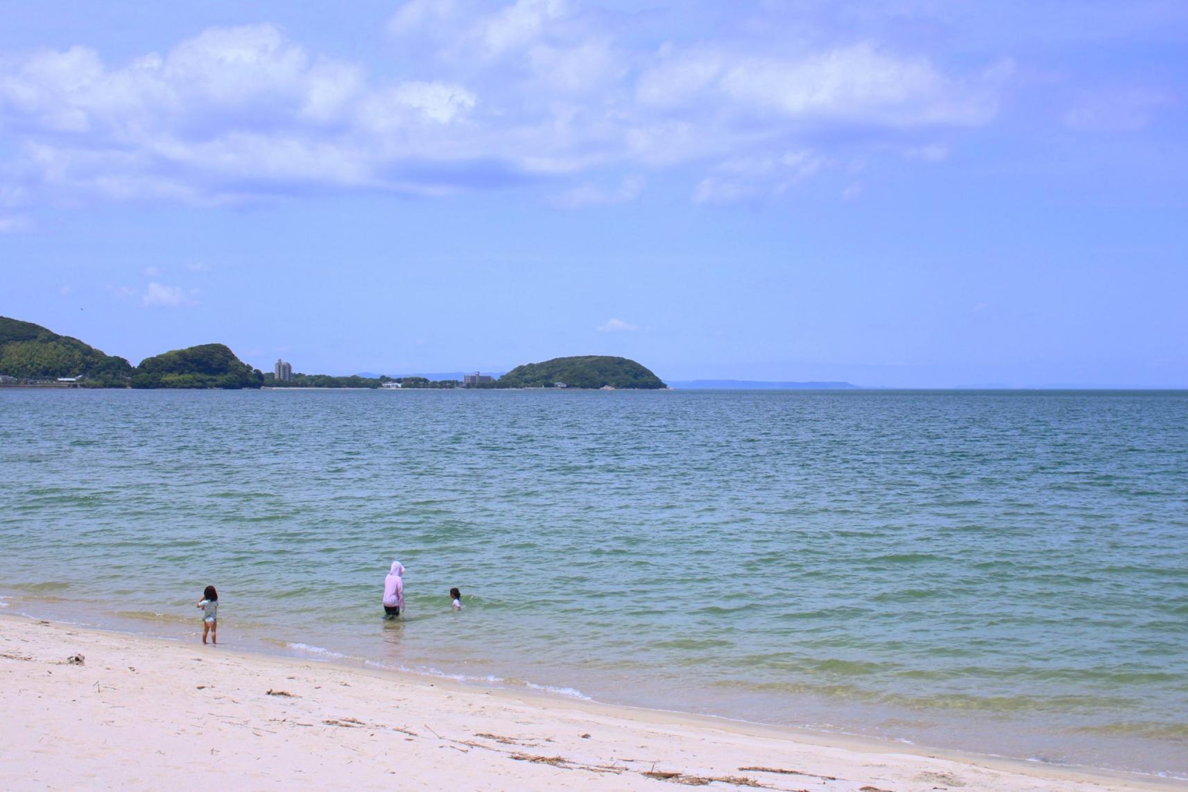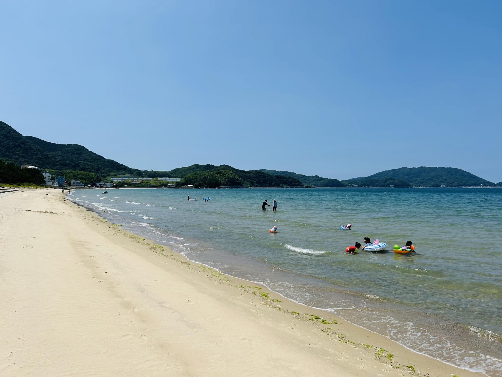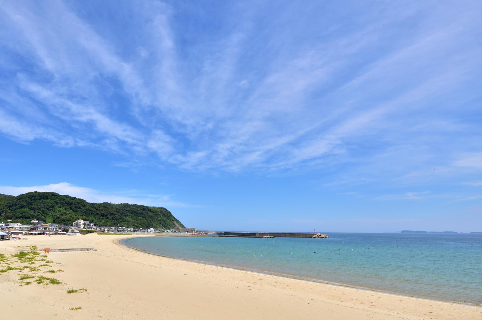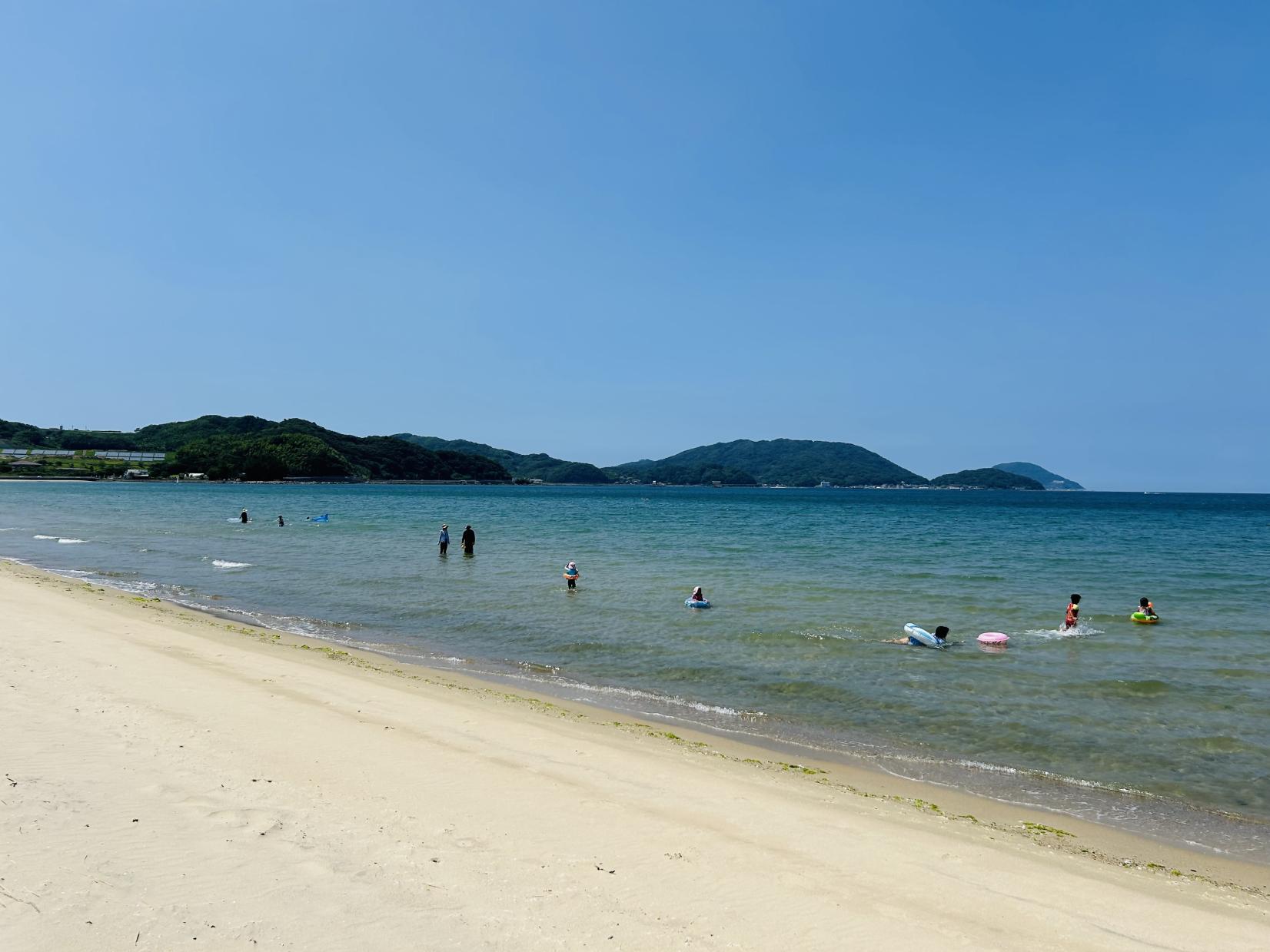 白い砂浜がなだらかな弓状になっており、美しい景色を作り出しています。波が穏やかなため、小さな子どもでも安心して楽しめ、夏には多くの海水浴客でにぎわいます。