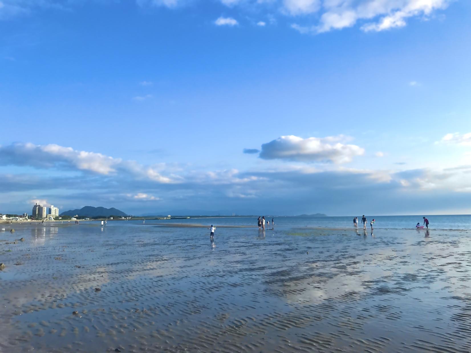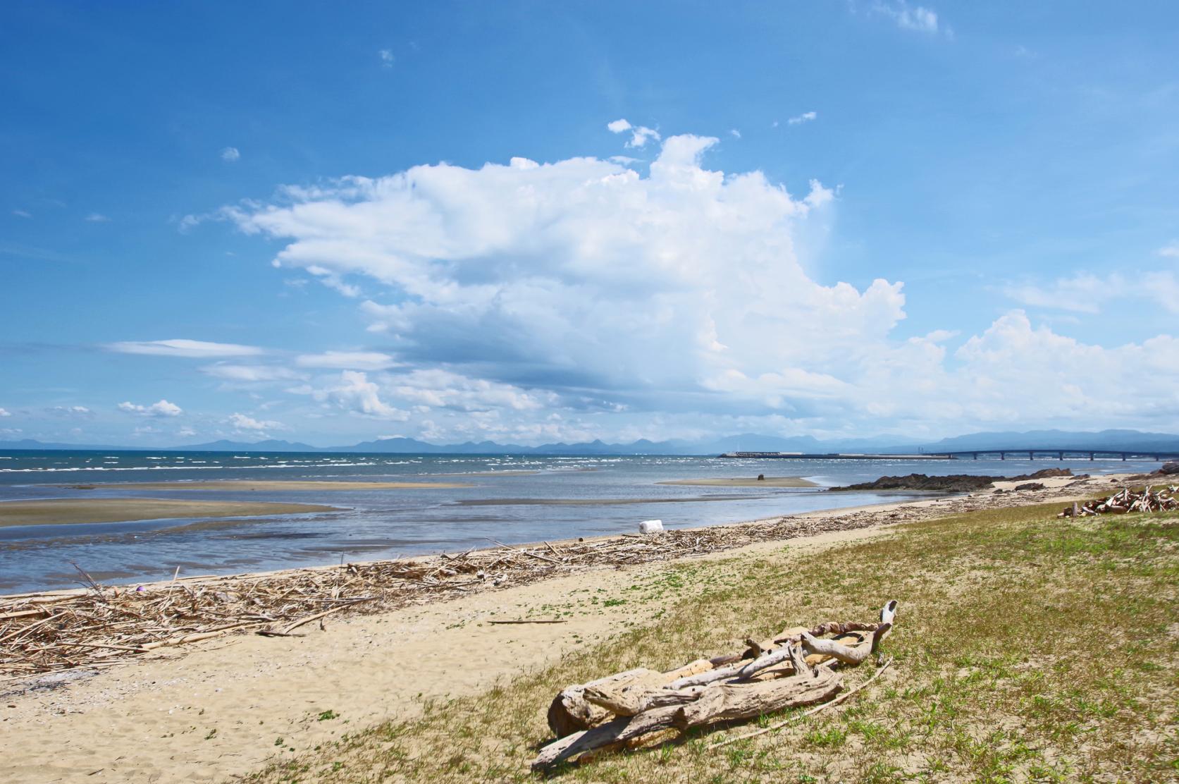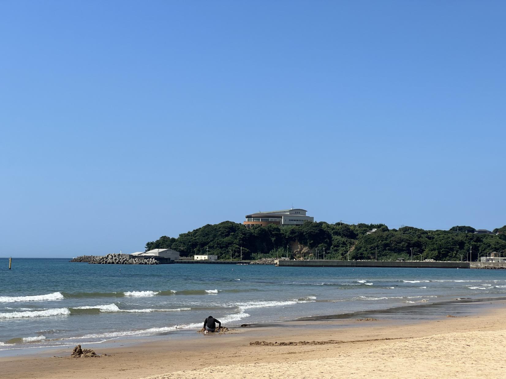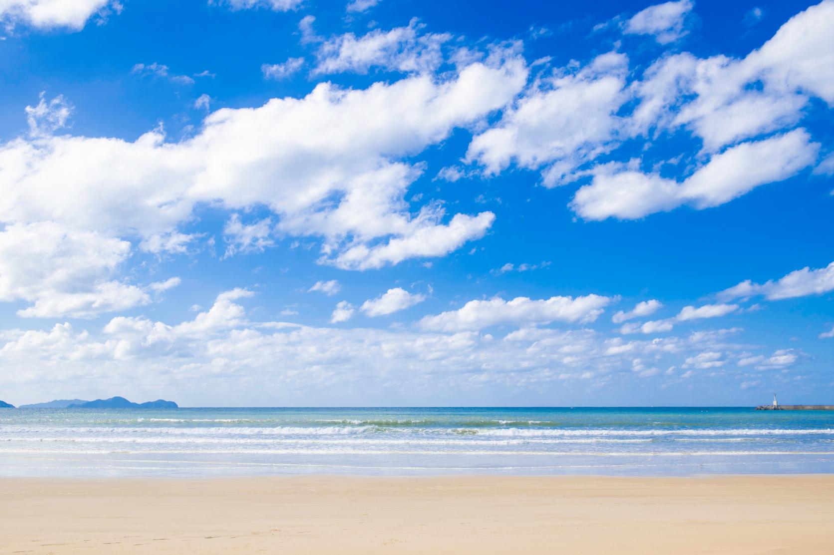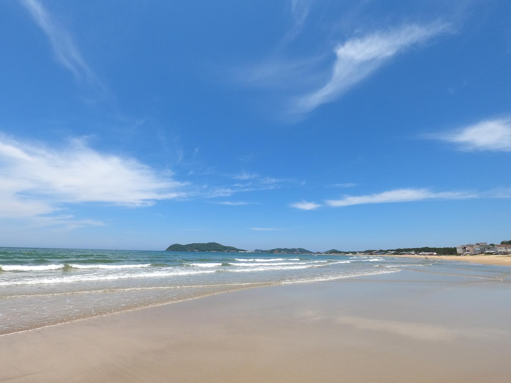 白い砂浜がなだらかな弓状になっており、美しい景色を作り出しています。波が穏やかなため、小さな子どもでも安心して楽しめ、夏には多くの海水浴客でにぎわいます。