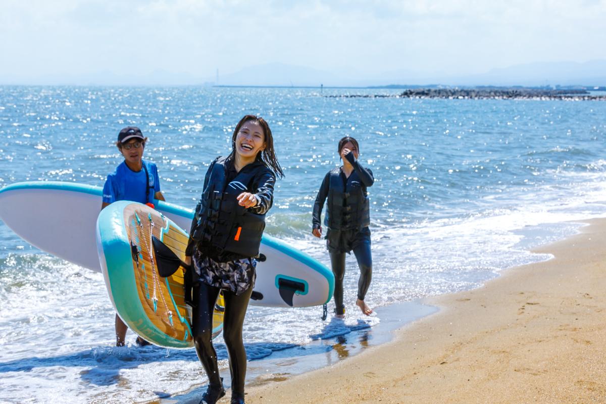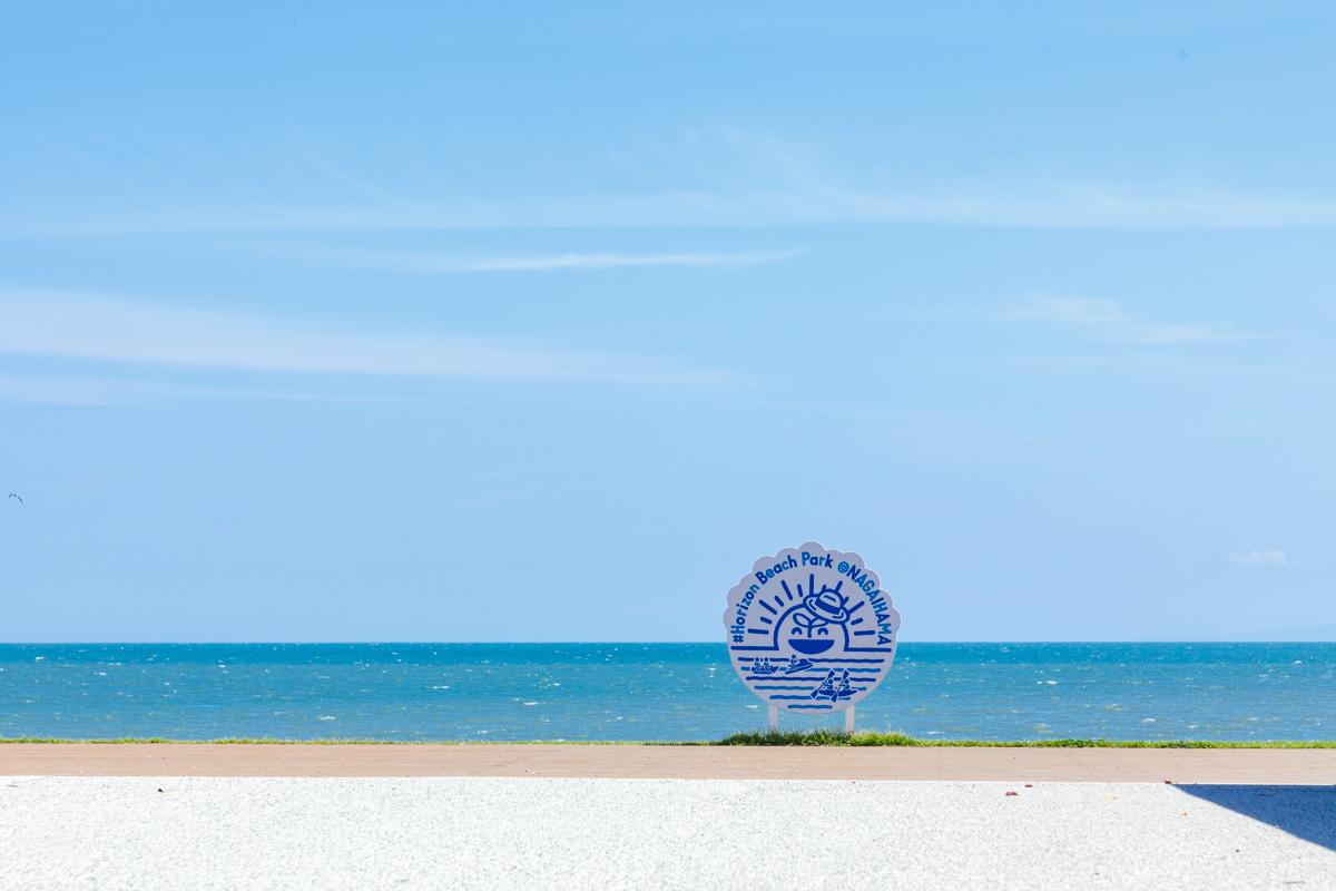 遠浅の海が広がる長井浜海水浴場。7月からの夏のシーズンには多くの人で賑わうビーチでは海水浴に加えて九州では珍しいフライボードやジェットパックをはじめとした、さまざまなマリンアクティビティも行えます。