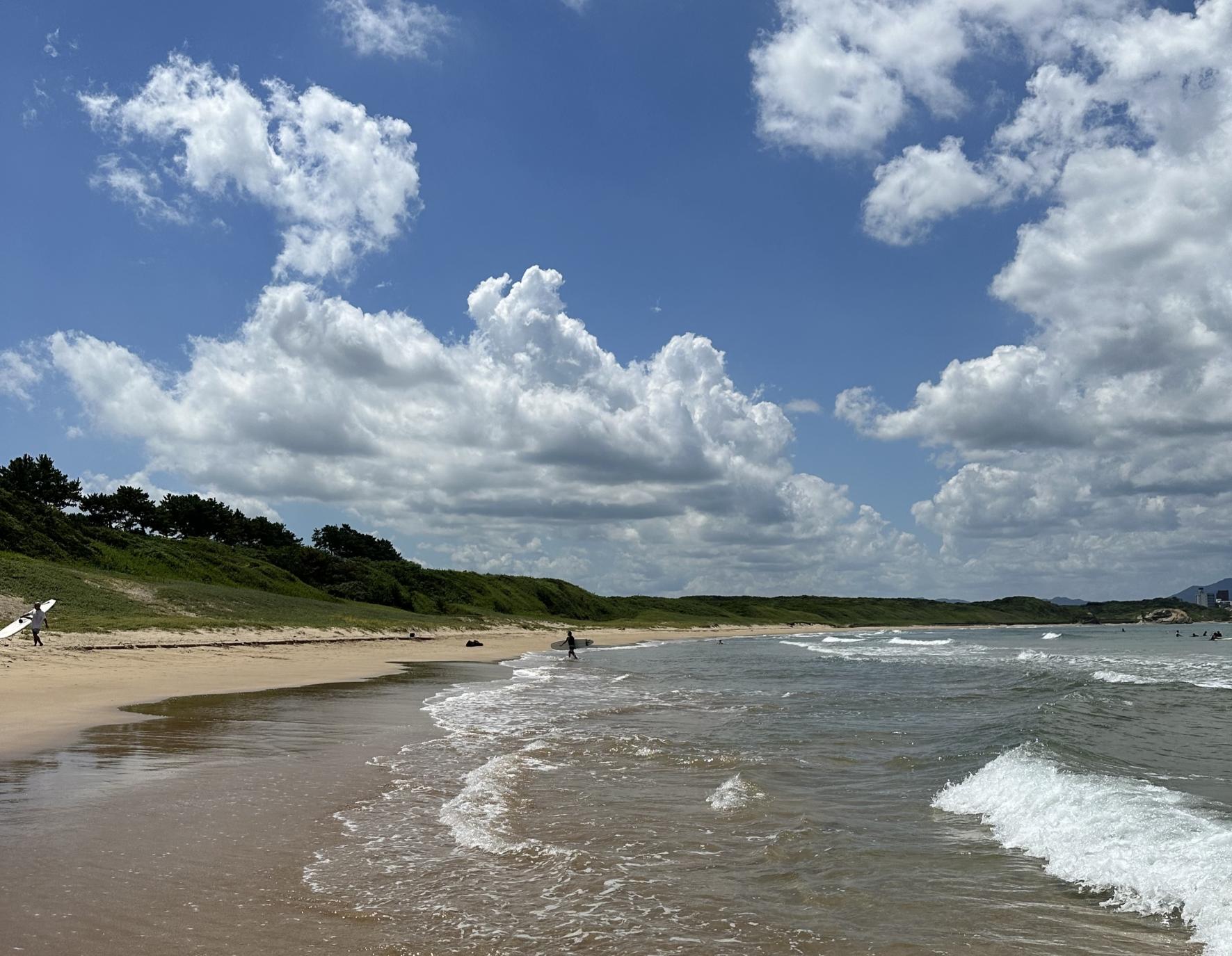 テラス席があるカフェが多く立ち並び、SUPやウインドサーフィンなどのマリンスポーツも盛んなビーチ。福津市観光情報ステーション「ビーチハウス」や、バーベキューができるショップ、ラグジュアリーなグランピング施設もあり、年間通して多くの人が訪れるビーチです。凹凸の少ないフラットな砂浜が続きます。