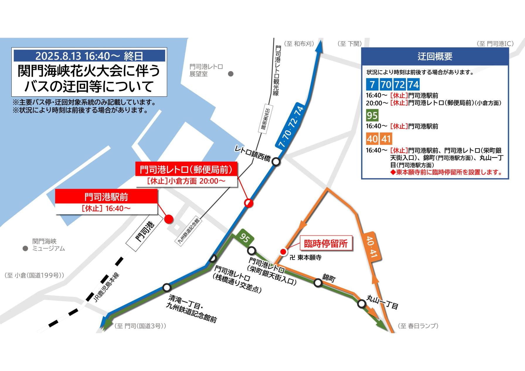 西鉄バス北九州では、「関門海峡花火大会」当日の8月13日(水)、一部系統で特別ダイヤでの運行および迂回運行、また花火終了後には臨時バスの運行を実施します。 通常とは異なる時刻・経路で運行するほか、渋滞による大幅な遅れも予想されますが、あらかじめご了承ください。