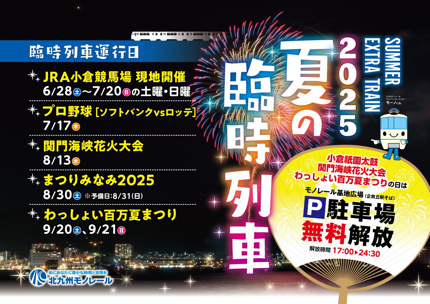 北九州モノレールでは、「関門海峡花火大会」当日の8月13日(水)、臨時列車の運行および車両基地駐車場の無料開放を行います。