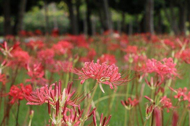 우미노나카미치에 가을을 알리는 진홍색 융단. 모험의 연못 주변에서는 약 4만 그루의 꽃무릇이 절정을 이루고 있습니다. 일반적으로 논이나 논두렁 등에 피는 이미지입니다만 원내에서는 나무숲 속에 피기 때문에 나무 사이로 떨어지는 햇빛을 받아 빛나는 꽃무릇 모습이 인상적입니다. 기분 좋은 가을 바람을 느끼며 감상해보세요! 9월 하순경까지 즐기실 수 있습니다.