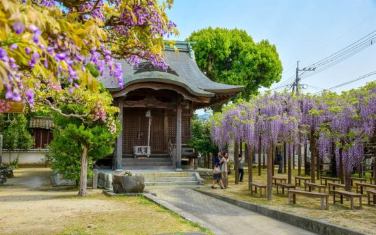 가미타카바 대신궁 경내에 있는 대왕 등나무꽃. 수령 100년 이상으로 뿌리둘레 약 2.7m, 등나무 울타리 면적 약 420평, 꽃송이 길이는 약 1m. 마을의 천연기념물로 지정되어 현재 '후지노사토 공원(등나무 마을 공원)'으로 공원이 정비되어 있습니다. 야간에는 라이트 업도 예정되어 있습니다.