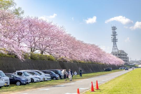 桜の名所でもあり、タイミングが合えば河川敷に咲くチューリップとのコラボレーションが楽しめます。