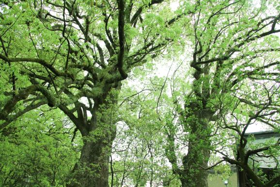 誠心館前の樹齢1,500年以上といわれる大樟、御本殿裏の2本の大樟が寄り添う夫婦樟は必見です。